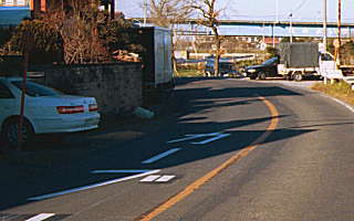 前方の軽トラックの脇に斜めになっているのが、草加方向のバス停です。